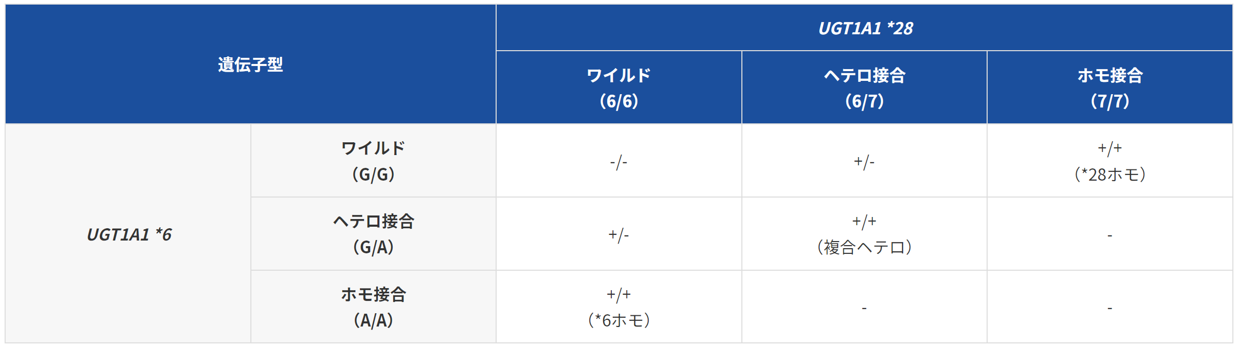 UGT1A1*28とUGT1A1*6をともに持たない野生型(-/-)やいずれかを持つヘテロ型(+/-)は上記と比べてハイリスクではありません。