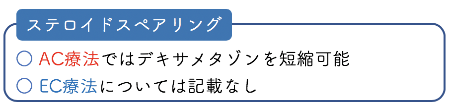 ただし高度催吐性リスクの中でもAC療法は2日目以降のデキサメタゾンの投与期間を省略可能でステロイドスペアリングと呼ばれます。ただし、AC療法以外の高度催吐性リスク抗がん薬ではエビデンスはありません。