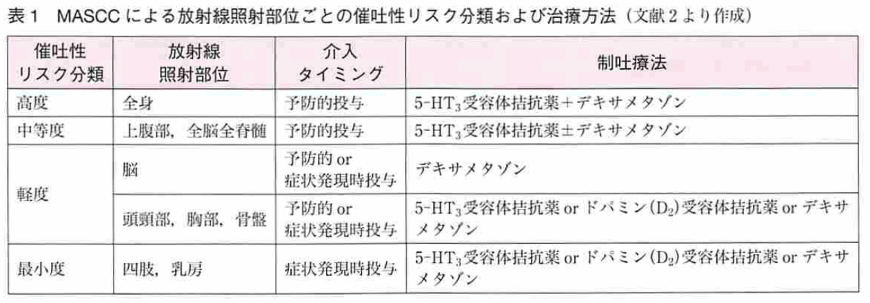 放射線治療による悪心・嘔吐に対しては、照射部位によるリスク分類を行い、リスクに応じてNK1受容体拮抗薬、デキサメタゾンを用います。