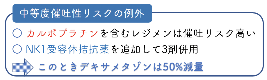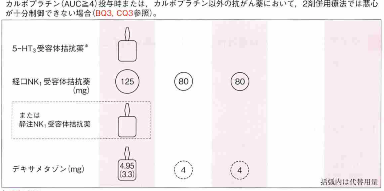 ただしカルボプラチン(AUC≧4)を含む治療レジメンにおいてはNK1受容体拮抗薬を追加した方が効果が高いため3剤併用(5HT3受容体拮抗薬、NK1受容体拮抗薬、デキサメタゾン)が基本になります。