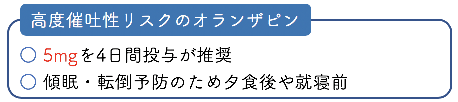 高度催吐性リスクでは3剤併用(5HT3受容体拮抗薬、NK1受容体拮抗薬、デキサメタゾン)にオランザピンを追加した4剤併用が基本です。処方の一例として以下のようになります。
