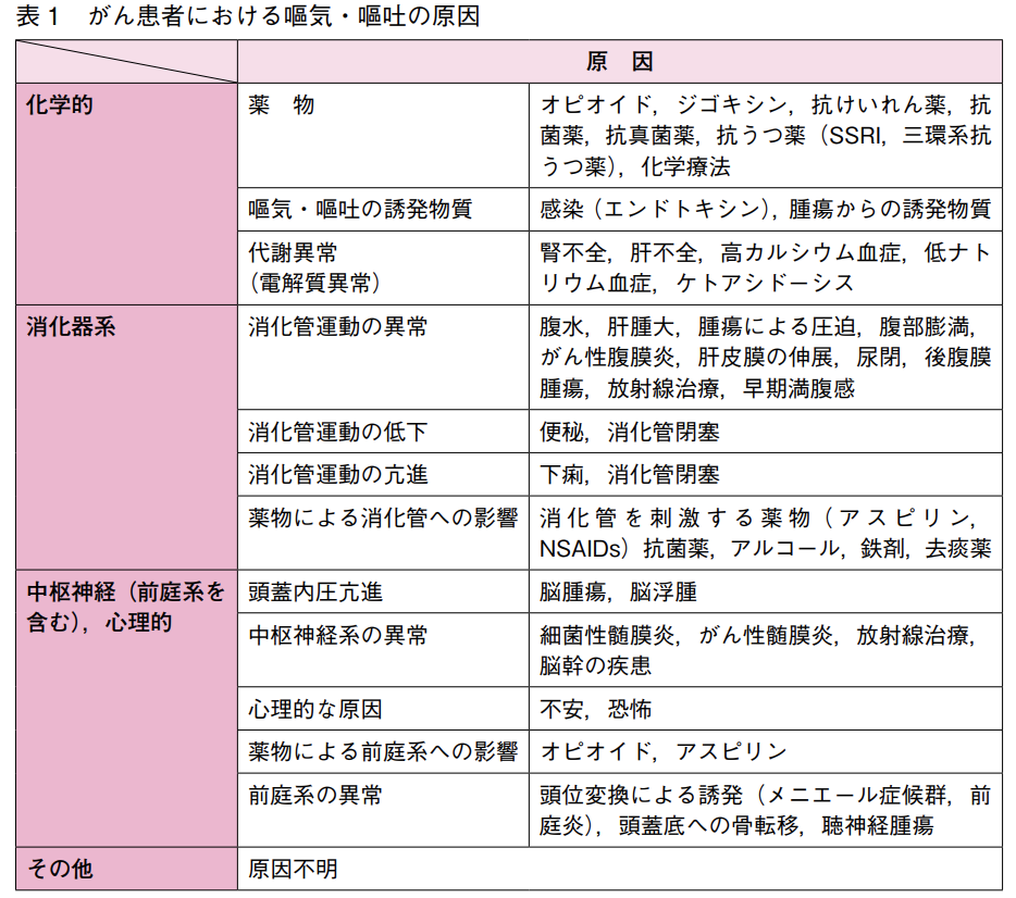 上記の抗がん剤投与後のタイミングに合致しない場合は抗がん薬以外の原因の可能性が高まるため、身体所見や検査によって鑑別すべきです。例えば、オピオイドによる副作用、高カルシウム血症などの電解質異常、腹膜転移、消化管バイパス術による影響、脳腫瘍・脳浮腫などがあります。