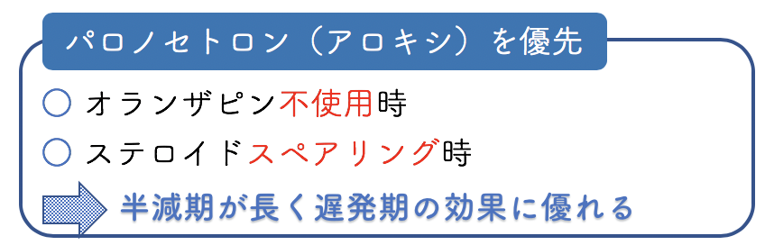 そこで遅発期の効果を増強させたいときはパロノセトロンを優先して使用することがあります。