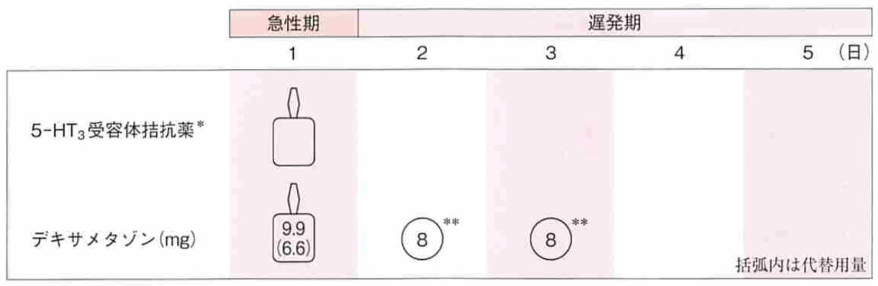 それぞれの時期に対して有効な予防薬が異なり、急性期は5HT3受容体拮抗薬、NK1受容体拮抗薬(第一世代)、デキサメタゾン、遅発期に有効な薬剤はNK1受容体拮抗薬(第二世代:パロノセトロン)、デキサメタゾンが有効です。これらを催吐性リスクに応じて組み合わせて使用します。