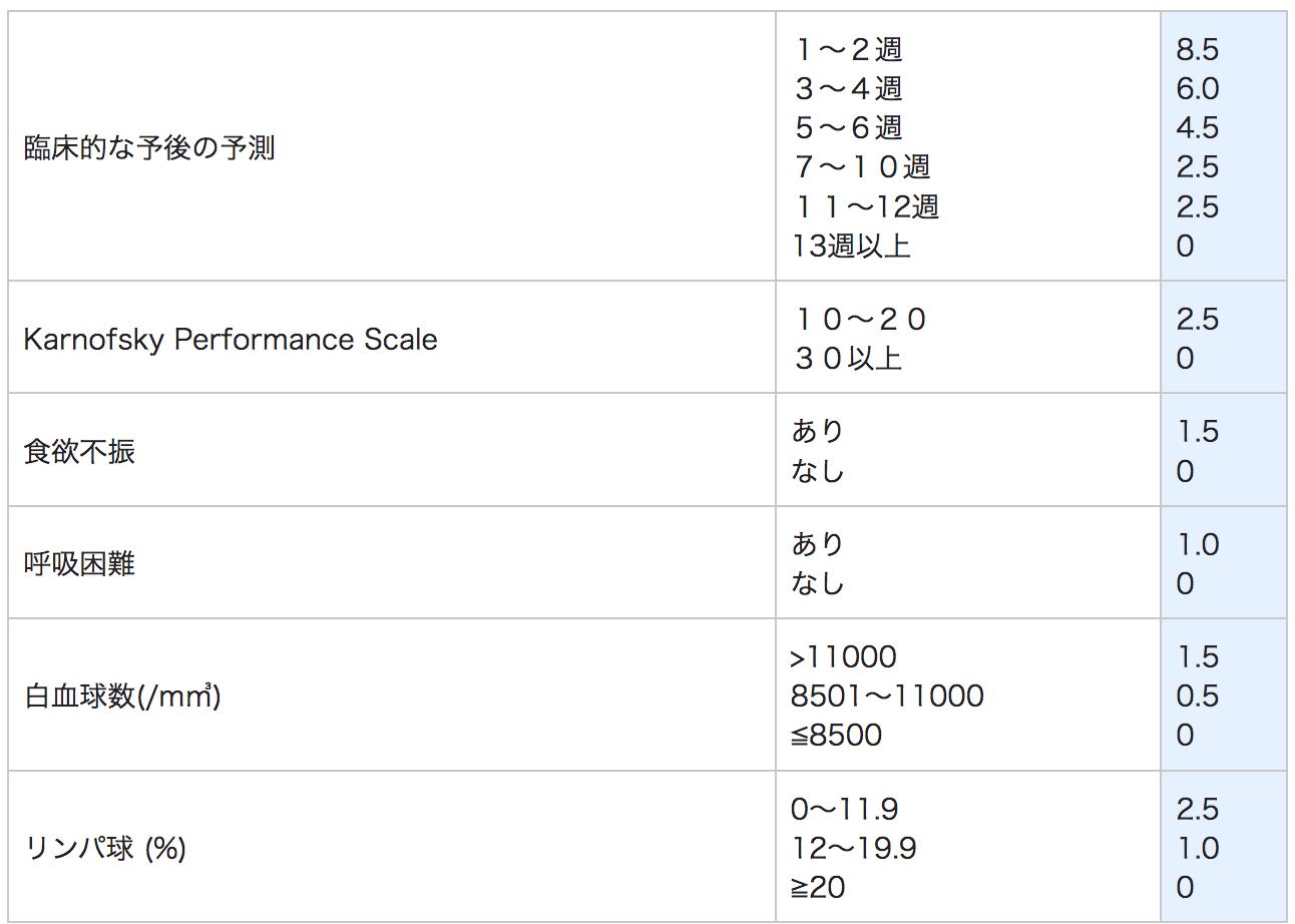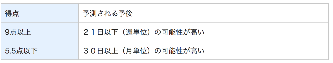 上記で計算された結果が大きいほど、予後が悪い結果となります。具体的には以下のような基準で考えられることが多いです。
