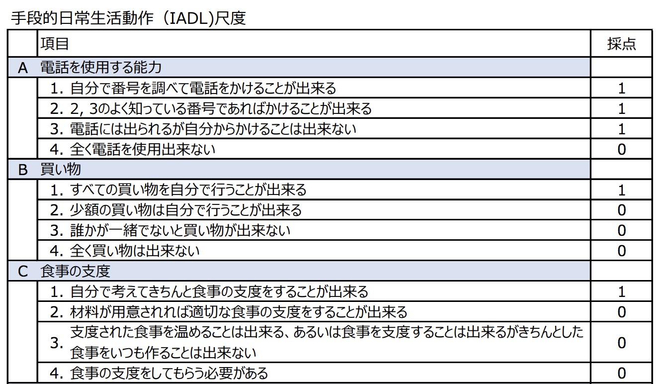 具体的な計算方法としてはLawtonの尺度、Barthel indexなどがあります。例えば以下はLawtonの尺度の一例になります。