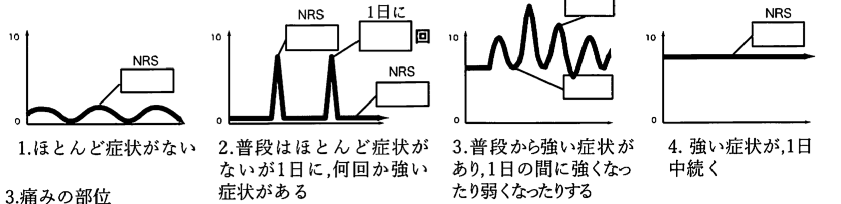 NRSやVASを用いて疼痛強度を評価します。また現在の痛み、一番強い痛み、弱い痛み、安静時の痛み、体動時痛の痛みに分けて評価すると良いです。